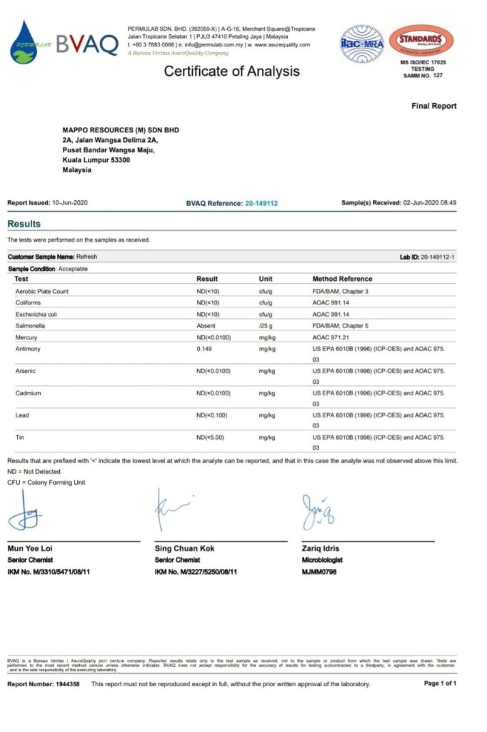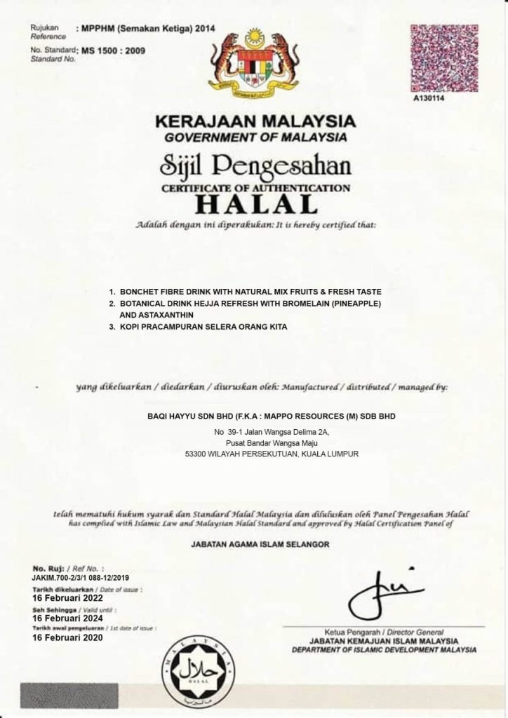 Kami sangat memahami dan ambil maklum tentang keselamatan pengguna. Jadi produk Hejja Refresh ini dah lalui pelbagai fasa ujian klinikal di makmal dan juga ia teleh pun mendapat pensijilan halal dari JAKIM.